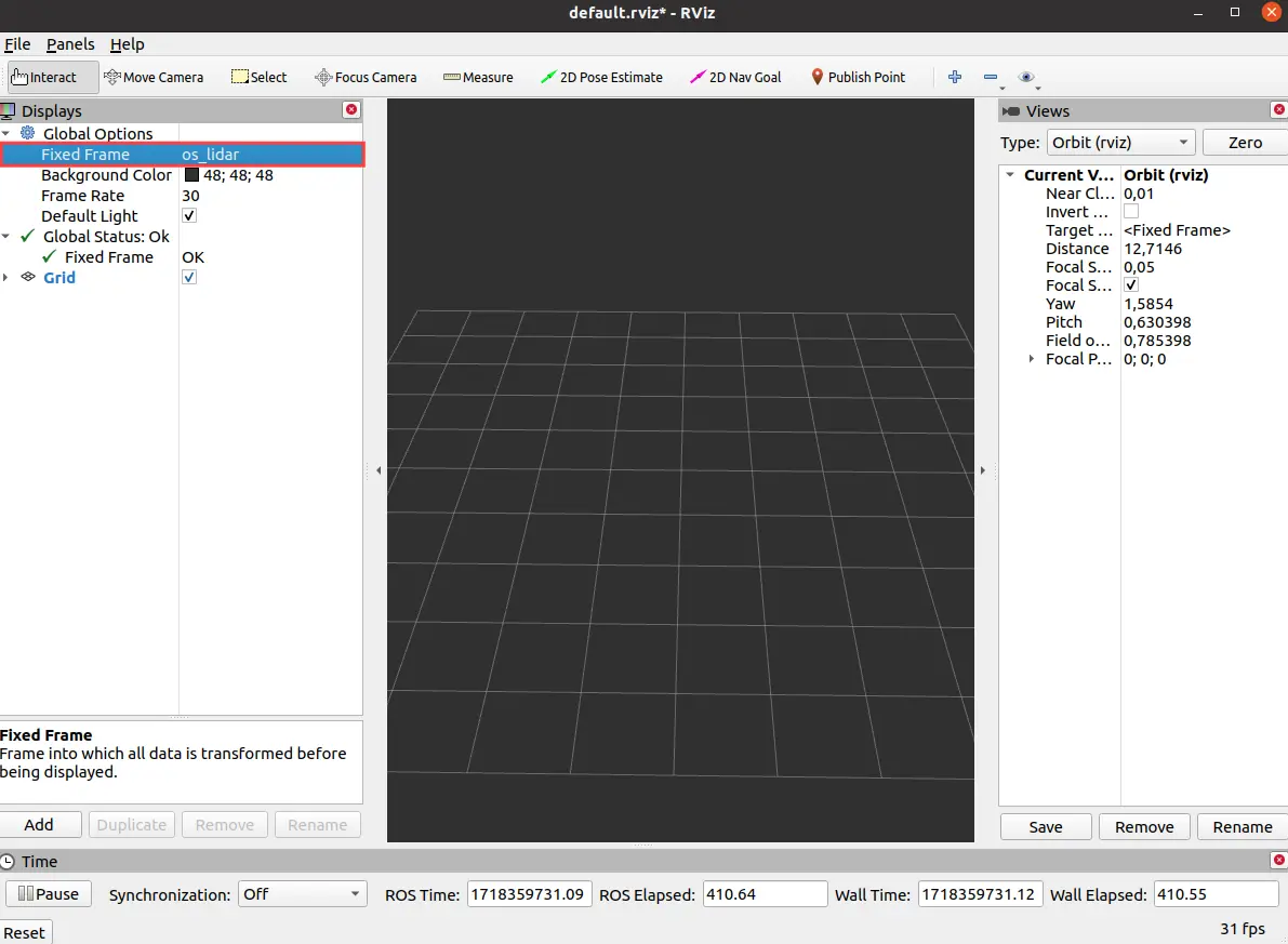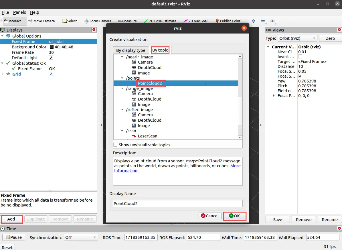 On the Displays panel click Add -> By topic and search for the /ouster/points topic. Choose the PointCloud2 display and click Ok.