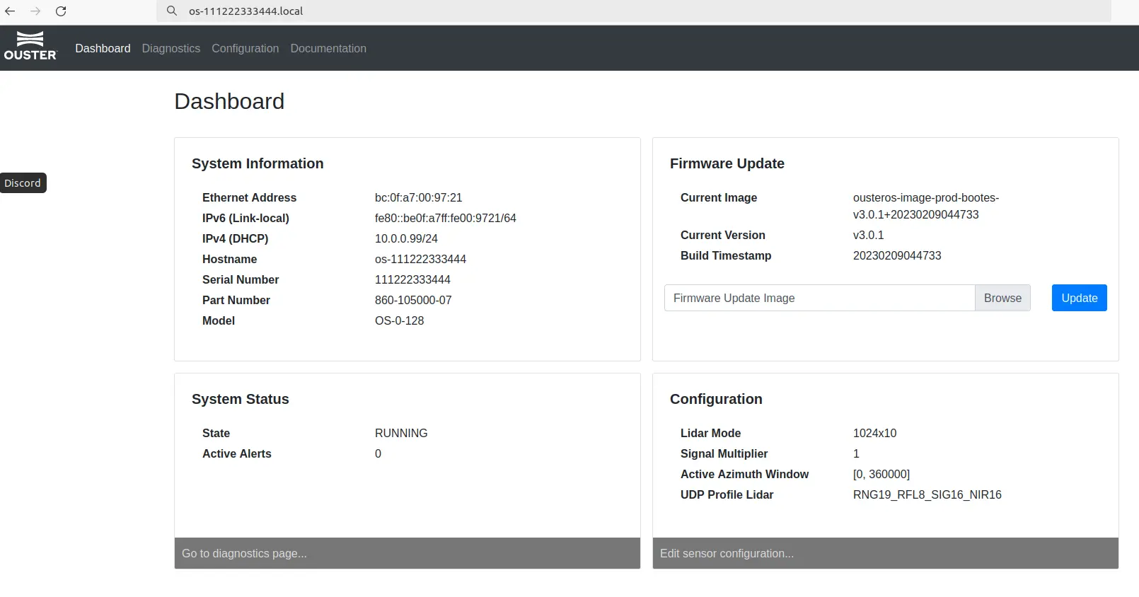 To ensure that the device has been connected successfully you can enter Ouster sensor dashboard. To do so open your browser of choice on a computer connected to rover's WiFi and go to address: os-sensor_serial_number.local