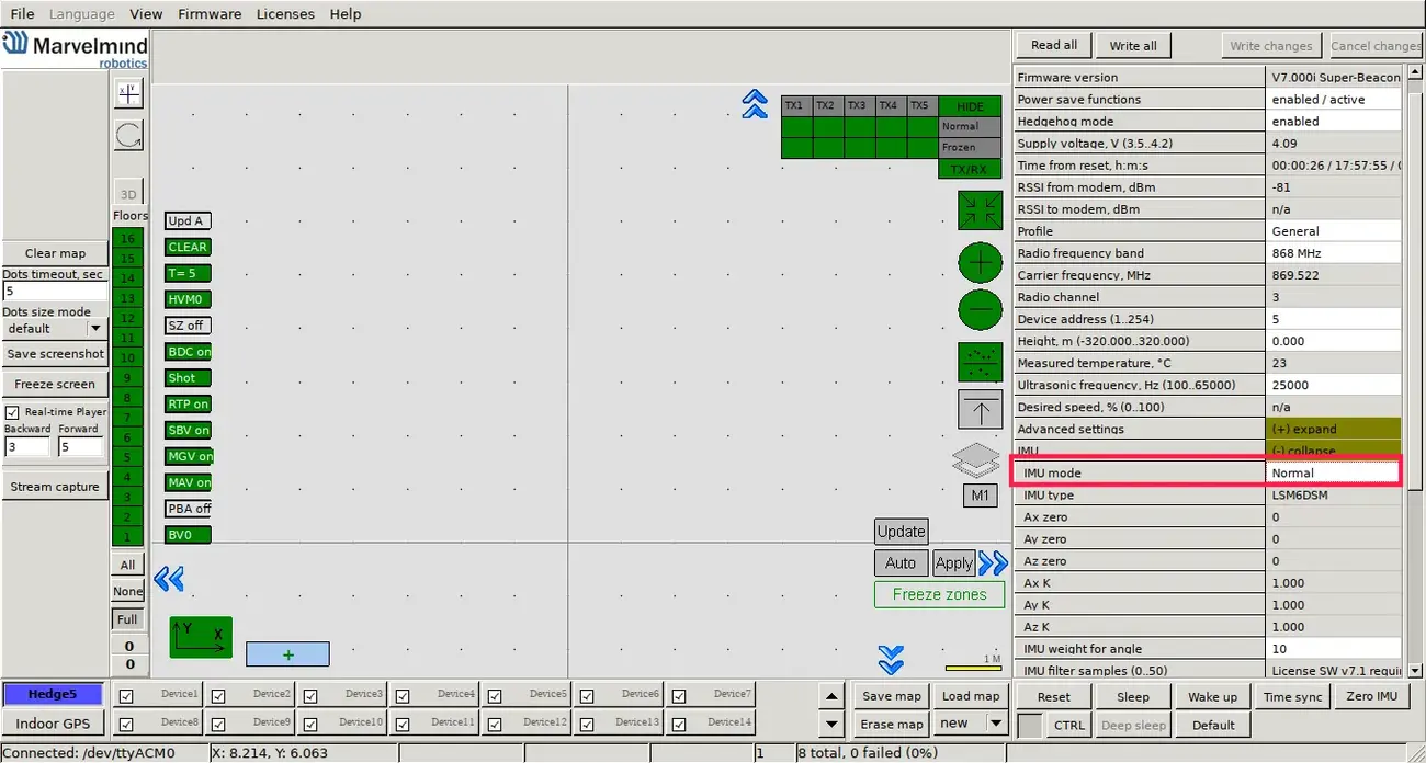 Only for the mobile beacon: in Interfaces section enable Processed IMU data and Raw internal sensors data.