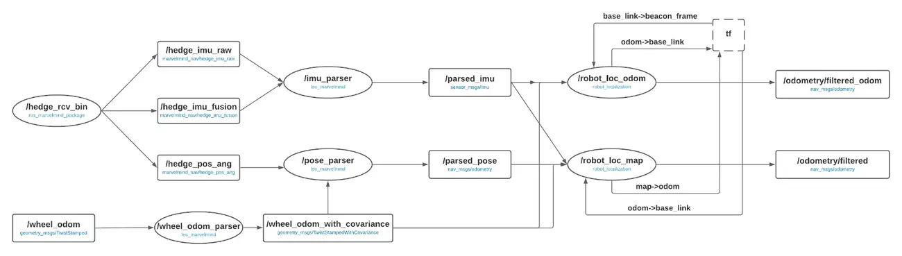 wheel_odom_parserwhich subscribes towheel_odomtopic, and adds to it covariance matrix. It's also publishing such message asTwistWithCovarianceStampedmsg onwheel_odom_with_covariancetopicpose_parserwhich takes the pose from marvelmind system, adds to the position wheel odometry with covariance, and publishes it asOdometrymsg.imu_parserwhich subscribes to marvelmind imu topics, and organizes two messages intosensor_msgs/Imurobot_loc_odomandrobot_loc_mapwhich are robot localization nodes. One publishing odom to base link transform, and the other map to odom.