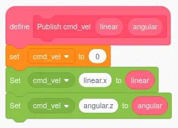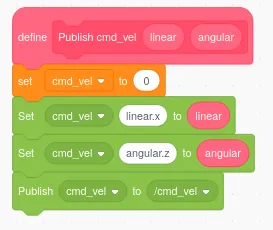 Now we need to fill this block. We pick our cmd_vel variable, and /cmd_vel topic from all available topics. In the end our function looks like this: