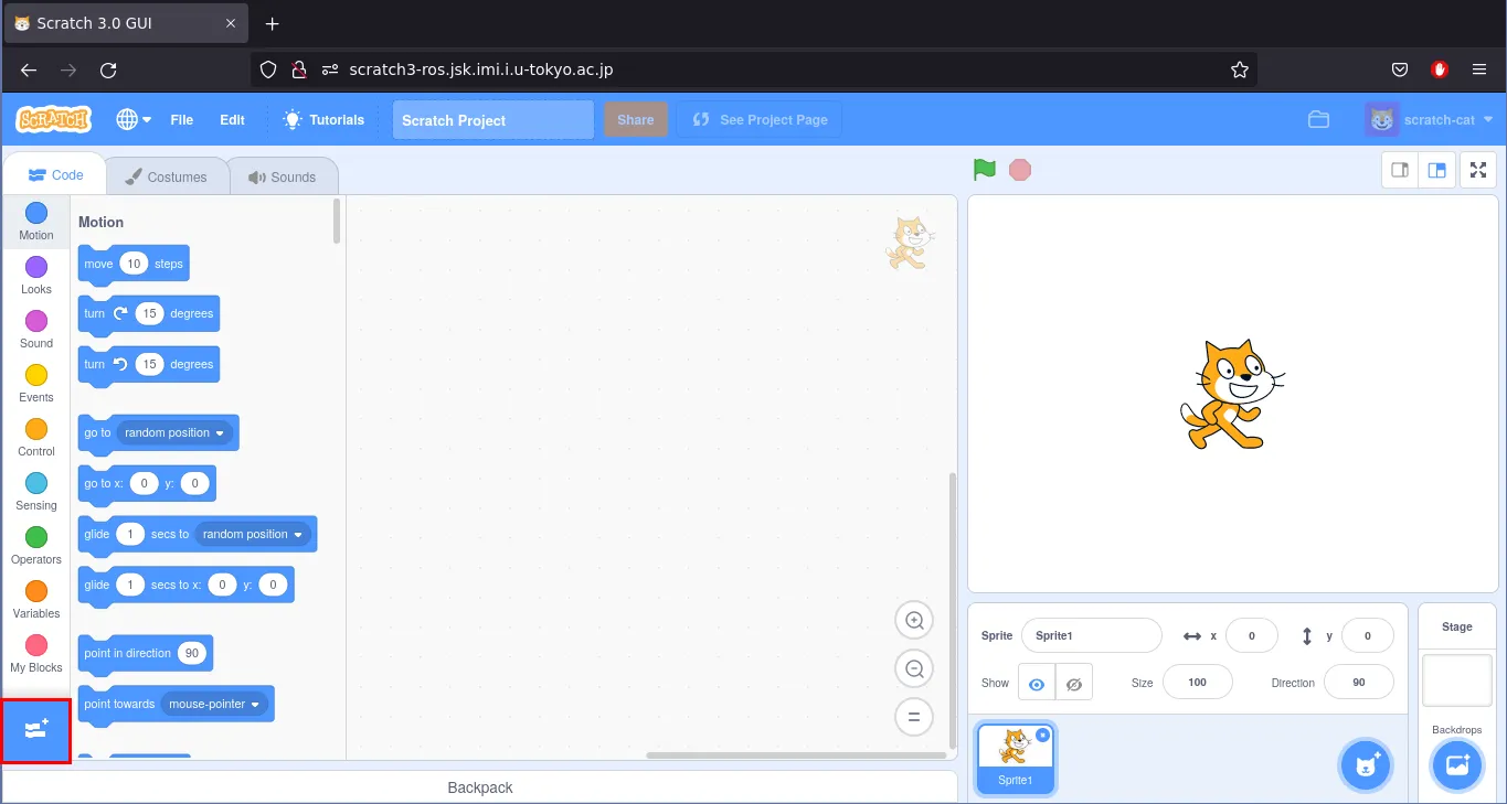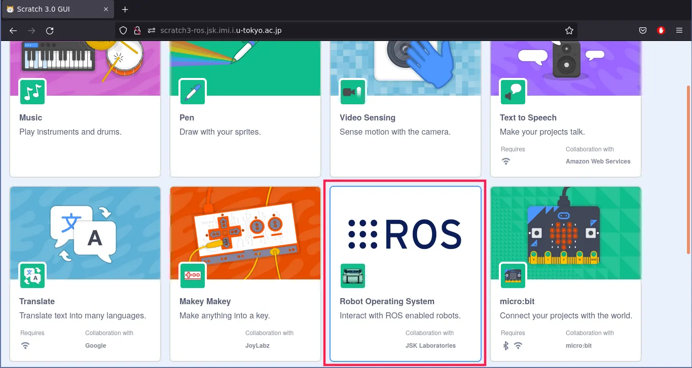 To program Leo Rover using Scratch, we need to add the ROS extension to the GUI.