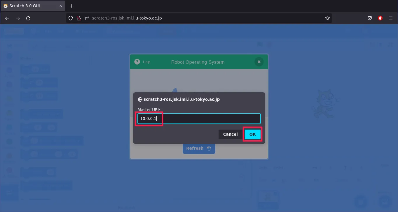 Then, in the Master URI field, type the rover's IP address (default 10.0.0.1) and press OK.