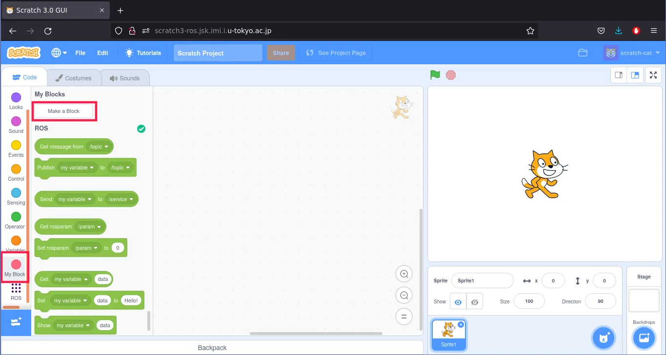 Start by defining new block. To do so, select from the left side of the screen My Block panel and press Make a Block.