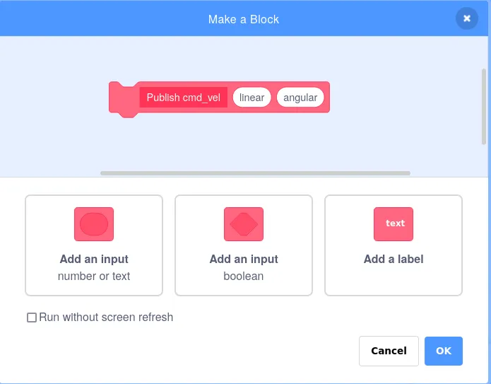 In the name write Publish cmd_vel, or any other name you want to call your function. Then add two input fields of type number or text. Name the first one linear, and the second angular and press OK. In the end, the block should look like this: