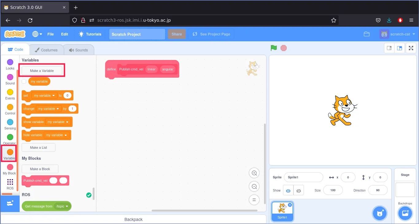 Now we need to make our variable, which will get the values from function, and will be published to the /cmd_vel topic. Similarly to making a new block, select from the panel on the left Variables and then Make a Variable. Name it cmd_vel or any other way, and press OK.