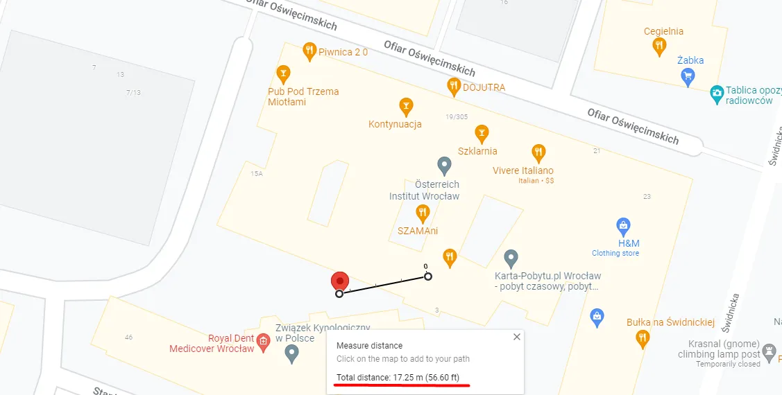 Right click on the map location you believe you are at and use "Measure distance" option at the bottom of the list. Then, create another spot for the distance measuring tool right where the red marker is. Google will then do the math and show you the distance between your real location and where the GPS module thinks it is.