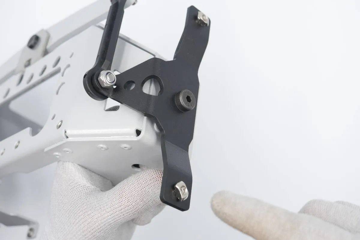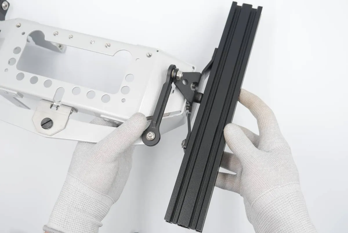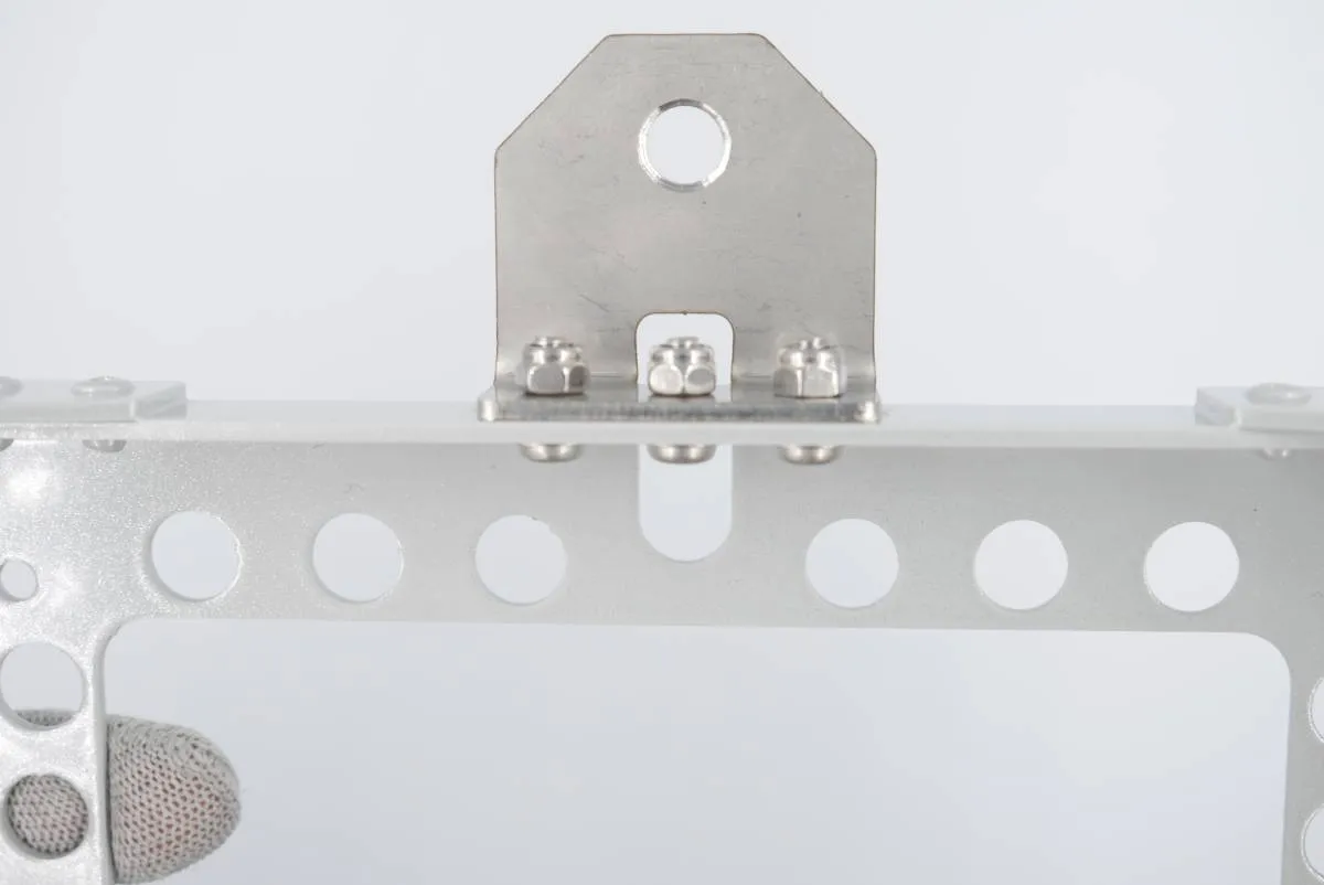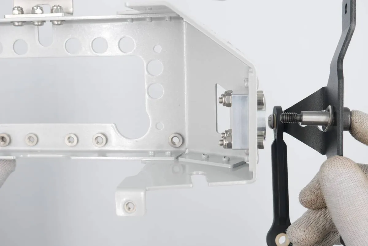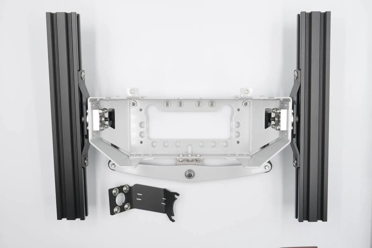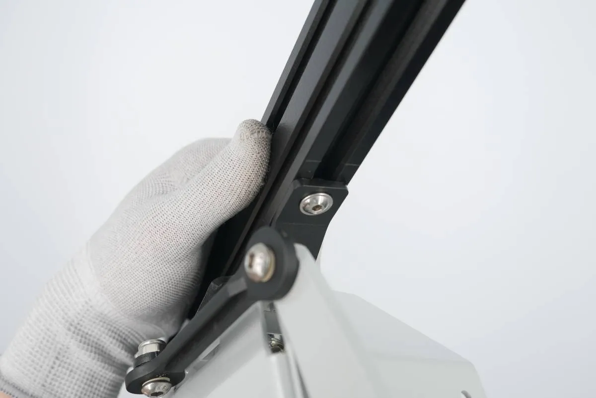Attach each of the wheel holders at the ends of the suspension beams, with the holders protruding outwards. Secure them by tightening the screws with a 4mm hex key.
