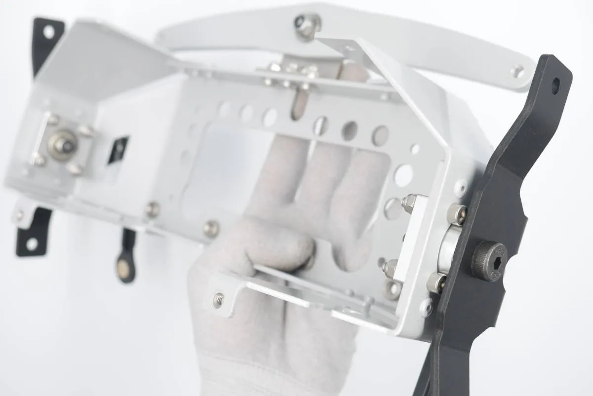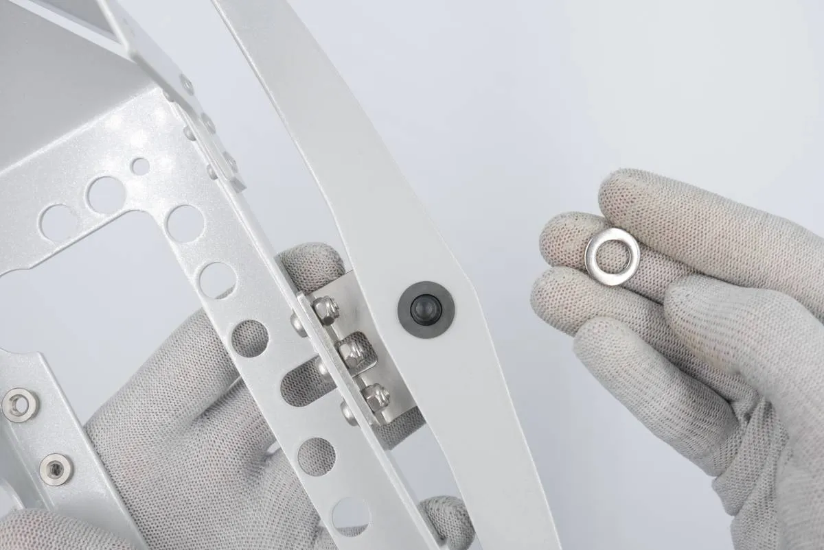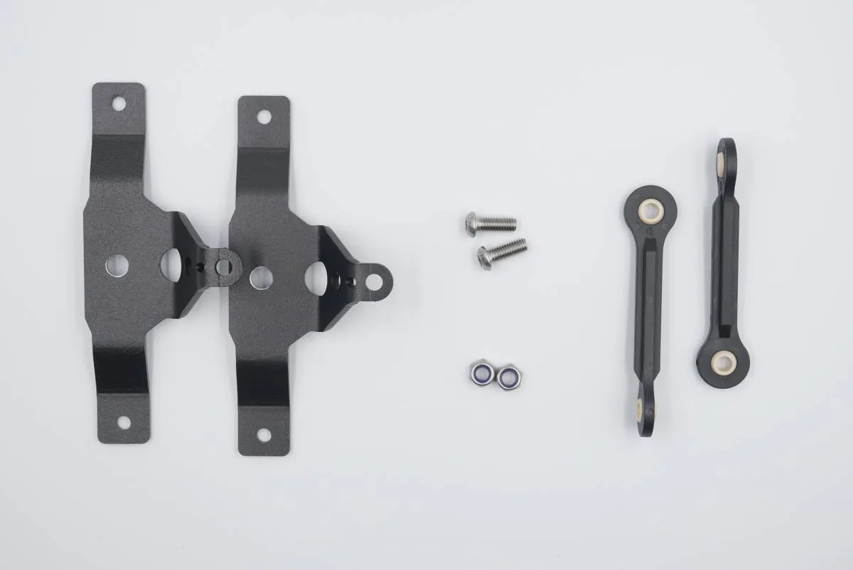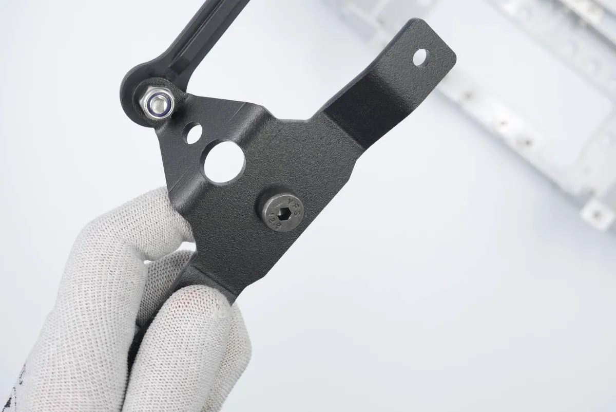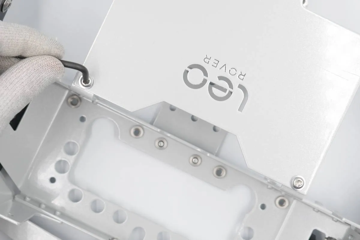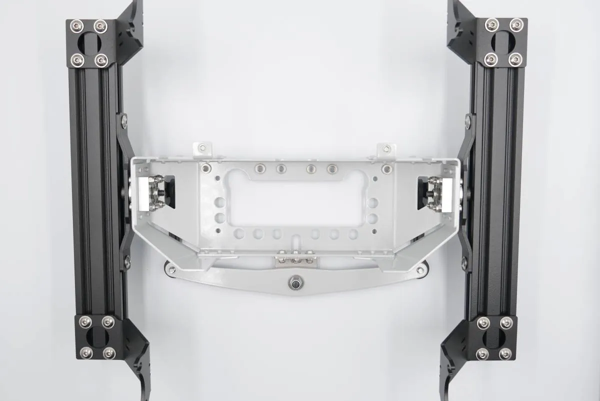 Attach each of the wheel holders at the ends of the suspension beams, with the holders protruding outwards. Secure them by tightening the screws with a 4mm hex key.