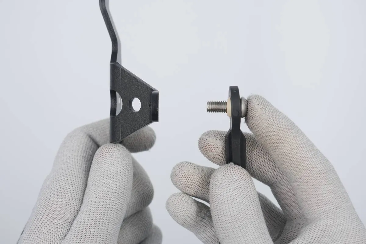 Take one differential arm, one plastic push-rod and one M6x16 screw and assemble them as in the photo.
