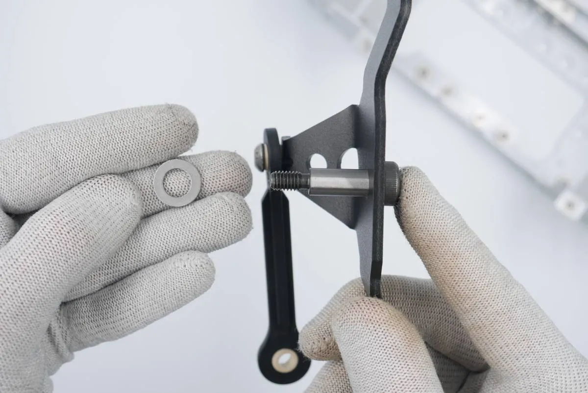 Insert the black shoulder screw into the differential holder hole. The shoulder screw head must face the upper part of the frame.